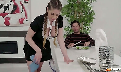 Hot busty maid with big bosoms gets fucked in the kitchen by her customer