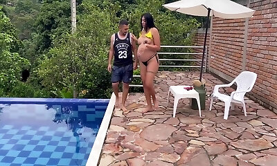 Fucking ebony pool cleaner at the backyard