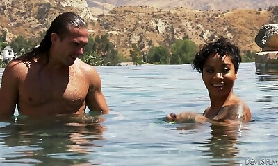 Nude ebony stunner Lala Ivey is swimming in the pool before a kinky sex with her white neighbor