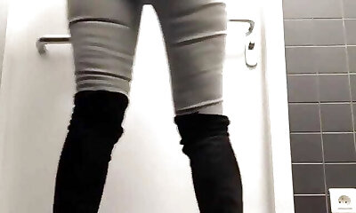 Chunky white young female in tight leggings pisses in the toilet