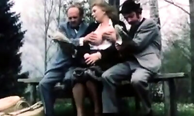 Hairy chicks having vintage outdoors threesome lovemaking in the backyard